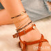 Quatre pièces coordonnées. Des perles discrètes et des coquillages qui ajoutent une note bohème. Le rendu est or satiné, fin et poli, juste ce qu’il faut pour capter le regard sans crier. Imagine une balade sur un marché d’automne : tes chevilles scintillent au rythme des feuilles qui tombent.