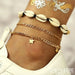 Trois pièces coordonnées pour jouer des reflets. Le motif coquillage capte la lumière, lisse et satiné. La finition est plaquée or ; l’ensemble scintille sans alourdir. Imagine une promenade au parc, feuilles rousses sous tes pas, et ces chaines qui glissent, douces et fluides, autour de ta cheville.
