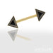 Matériau : acier inoxydable doré. Taille : barbell 14G (1,6 mm) - longueur 16 mm. Fermeture : embout vissable en forme de triangle, sûr et pratique. Finition brillante qui résiste au ternissement pour conserver son éclat au fil du temps. Texture : lisse et douce au contact, pensée pour ne pas accrocher les tissus.