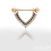 Ce piercing téton se compose d’un alliage hypoallergénique, léger et agréable au porter. La finition dorée capte la lumière et crée un scintillement doux, sans lourdeur visuelle. Le pendentif triangulaire mesure 12 mm de hauteur sur 10 mm de base, une taille subtile mais identifiable.